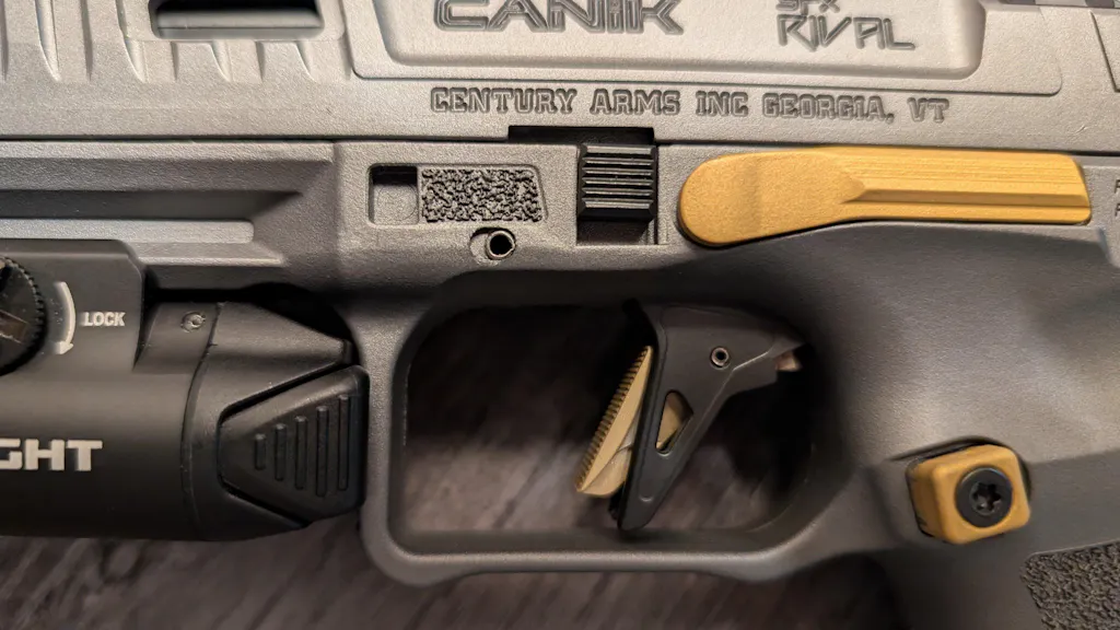 This design uses a longer roll pin of the same diameter as the OE Canik pin. So the install is as simple as pushing the old pin out and installing the Thumb Rest/Roll pin assembly.